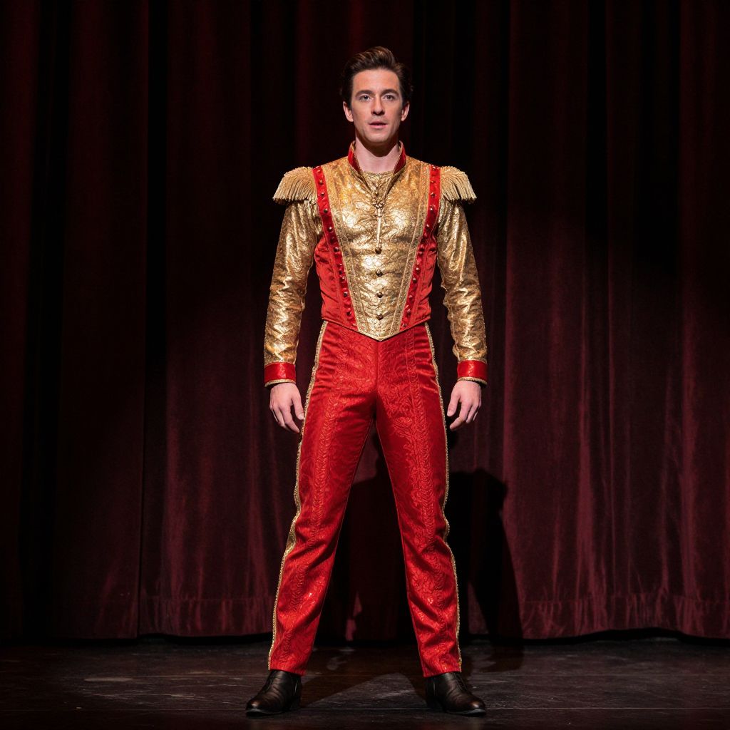 Photograph of a man standing center stage against a dark red velvet curtain backdrop. He is wearing a vibrant red, sequined jumpsuit with gold, long-sleeved, epaulet-adorned shirt. The jumpsuit has red suspenders with gold buttons. His black shoes contrast with the colorful outfit. The man has short, dark brown hair, fair skin, and an expressionless face. The stage lighting highlights his outfit, casting a slight shadow to his left. The overall style is reminiscent of a circus or theatrical performer's costume.
