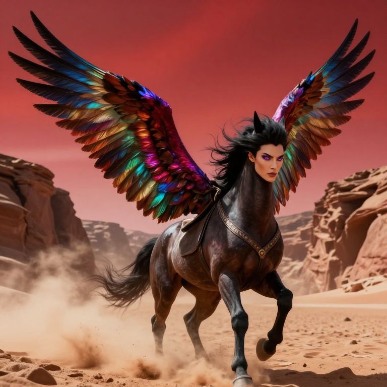 Digital artwork of a powerful, black winged Pegasus with vibrant, multi-colored feathers in shades of blue, green, and red. The Pegasus has a muscular build and is adorned with a silver harness. Its mane and tail flow wildly as it gallops through a desert landscape with red-hued, rocky formations in the background. The sky is a vivid red, adding an intense, dramatic atmosphere. Dust clouds surround the Pegasus's hooves, enhancing the sense of movement. The Pegasus's piercing gaze and intense expression add a sense of mystique and strength to the image.