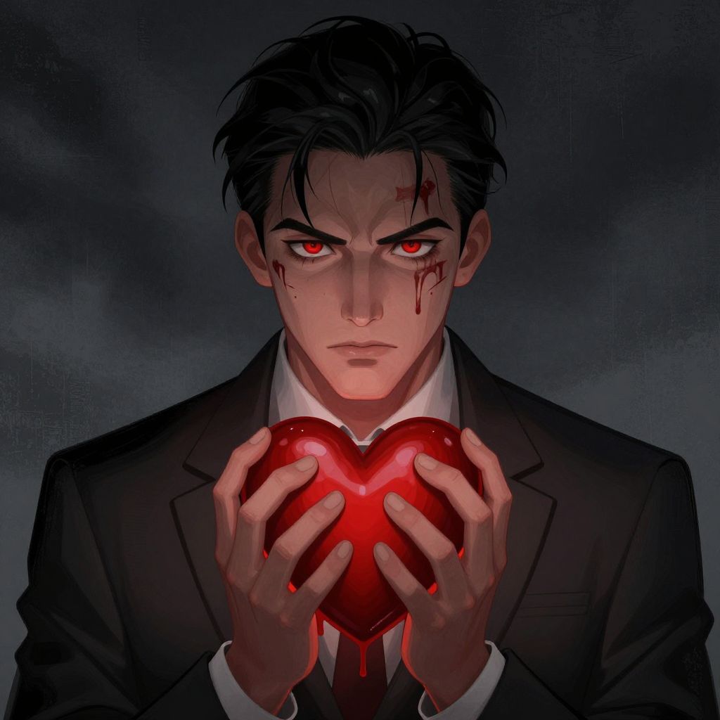 DGC style digital illustration, Magic style, Close-up, The image is a digital illustration of a man in a dark suit holding a red heart in his hands, The man has dark hair and red eyes, and his face is covered in blood, The background is a dark grey color with a grungy texture, giving the impression of a stormy sky, The heart is dripping down the man's hands, creating a dripping effect, The overall mood of the image is dark and ominous