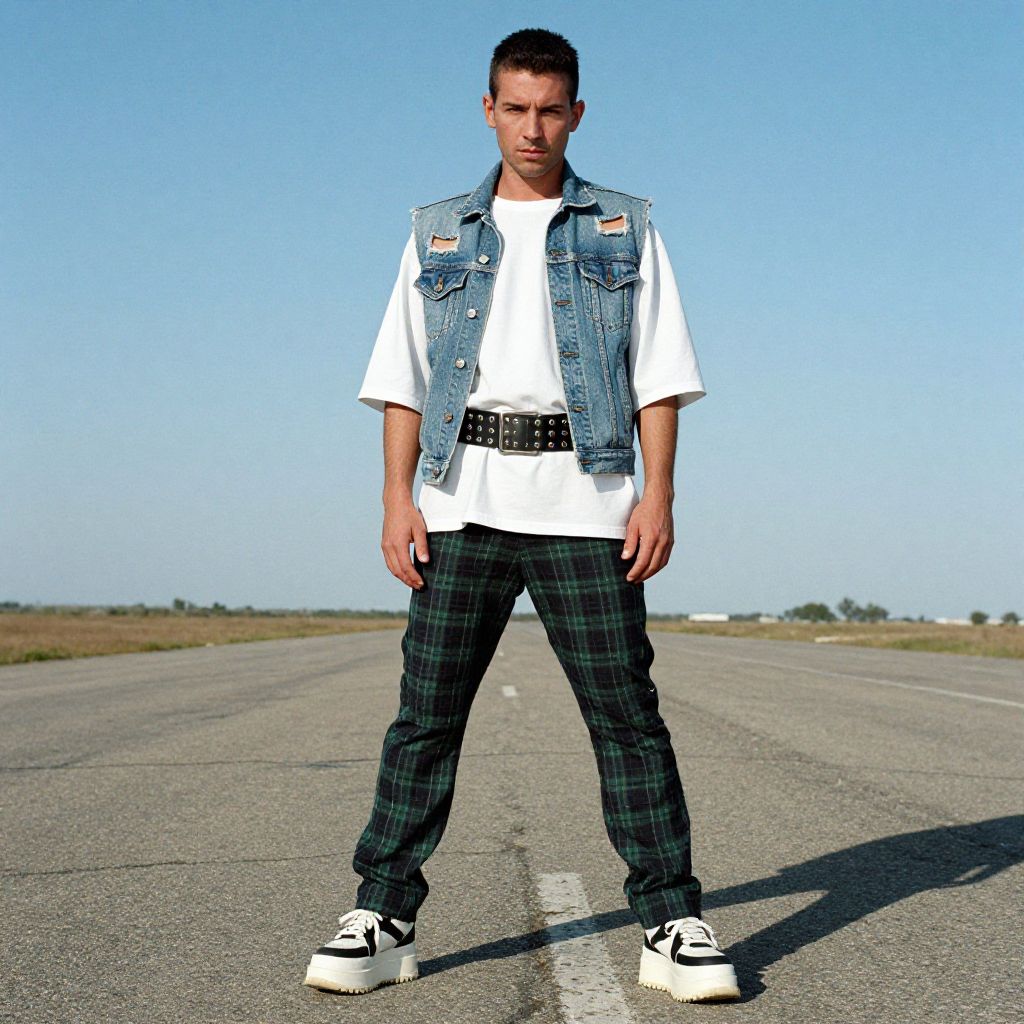 A man, distressed denim vest, white oversized shirt, green and black plaid pants, wide studded belt, chunky platform sneakers, sprawling tarmac under a clear blue sky, hand-tinted photograph, confident expression Man has masculine face and piercing eyes