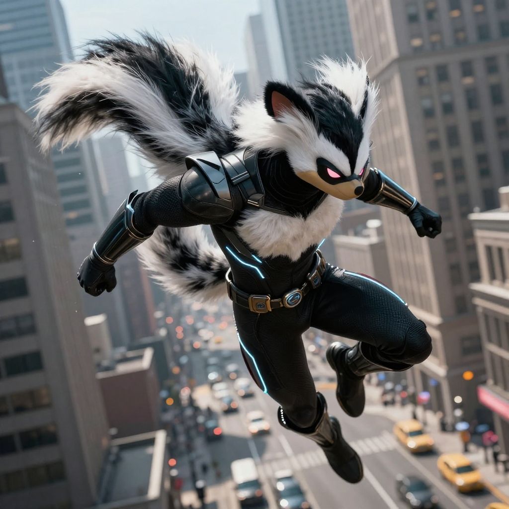 Skunk superhero crouching atop a skyscraper at night, glowing eyes piercing through the darkness, sleek sci-fi armor with black and white patterns, city lights below, cinematic composition