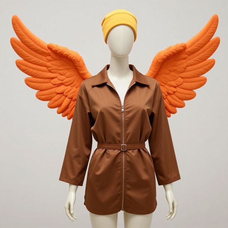 Mannequin wearing a brown outfit with orange wings and a yellow headpiece.