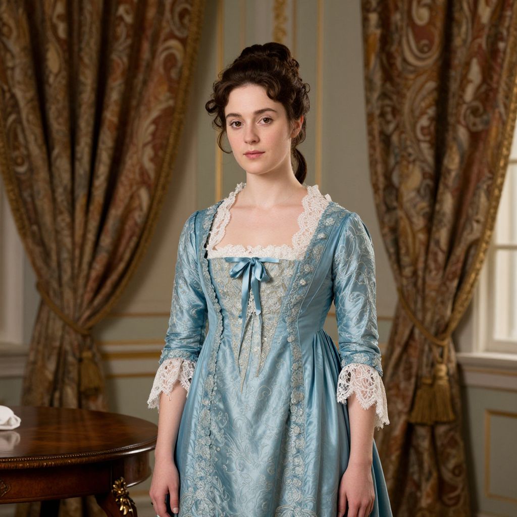 A digital portrait rendered in a classical style depicts a woman adorned in an elegant blue gown with intricate lace detailing, set against a backdrop of richly textured curtains and a polished wooden table, evoking the timeless elegance reminiscent of Jane Austen's era.