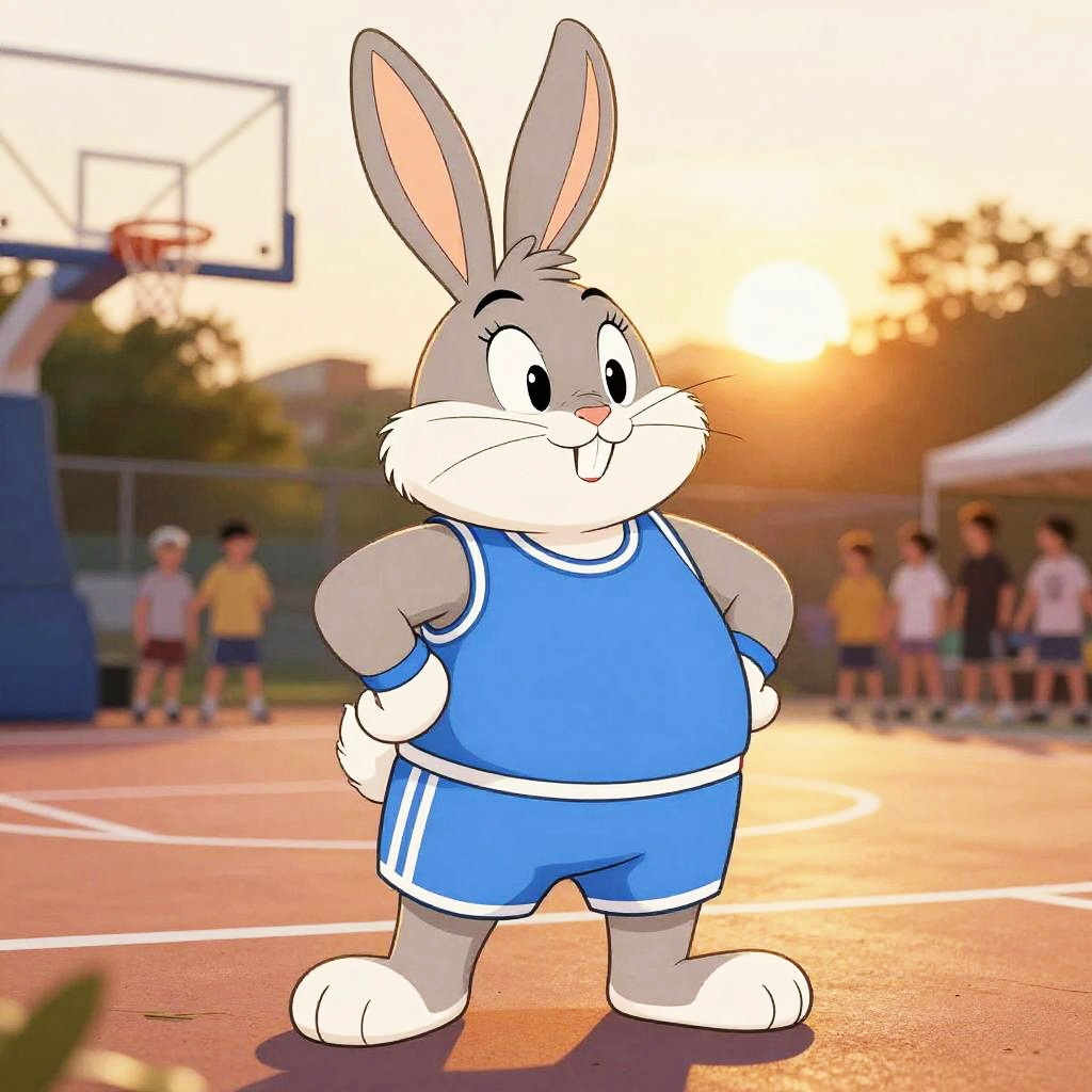 Cartoon grey rabbit in blue basketball uniform, standing confidently on outdoor court at sunset, background includes blurred people and basketball hoop.