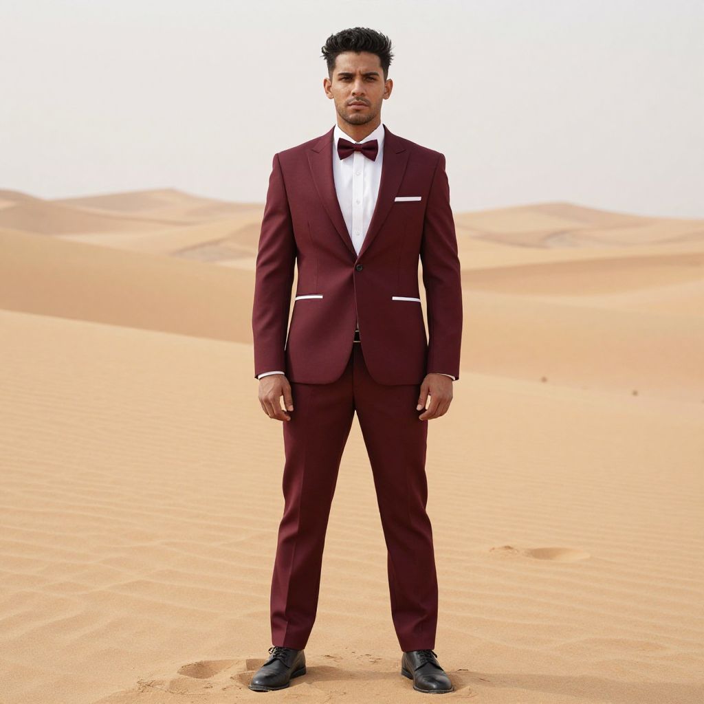 "Wedding Night Costume, man in a maroon and white jacket standing in the desert"