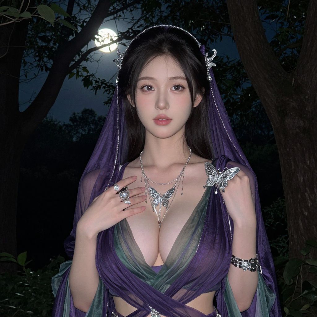This is a digitally rendered image of an East Asian woman with long, dark brown hair, wearing a sheer, purple veil adorned with silver butterfly accessories. She has fair skin, large, expressive brown eyes, and full lips. Her outfit reveals large, ample breasts, partially covered by a deep V-neck, sheer top. She wears a silver butterfly necklace and a matching ring on her right hand, which rests on her chest. The background is a dark forest with a full moon shining through the trees, creating a mystical, ethereal atmosphere. The image has a high-contrast, hyper-realistic style.