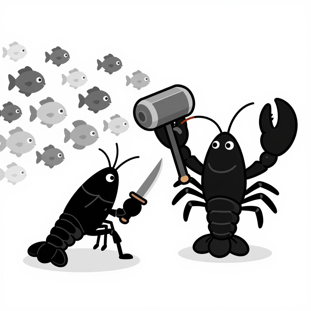 Futuristic A cute black and white drawing of a Crawfish holding a knife fighting a cute large lobster holding a battle hammer. In the background is a crowd of fish and sea life cheering on this epic battle. cartoon, Clean 2d illustration, on white bg,