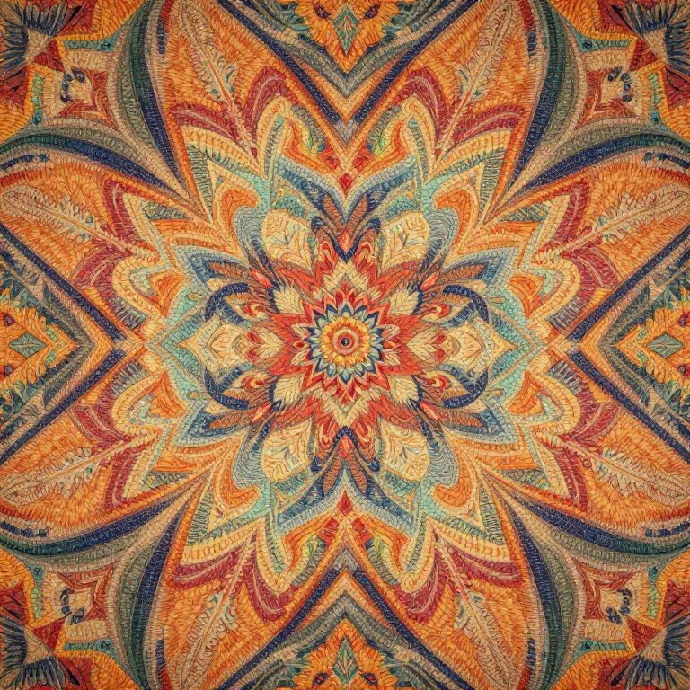 A vibrant tapestry of interconnected patterns radiates warmth and serenity, inviting the viewer into a meditative journey where the interplay of colors and textures evokes a sense of harmony and infinite possibility.