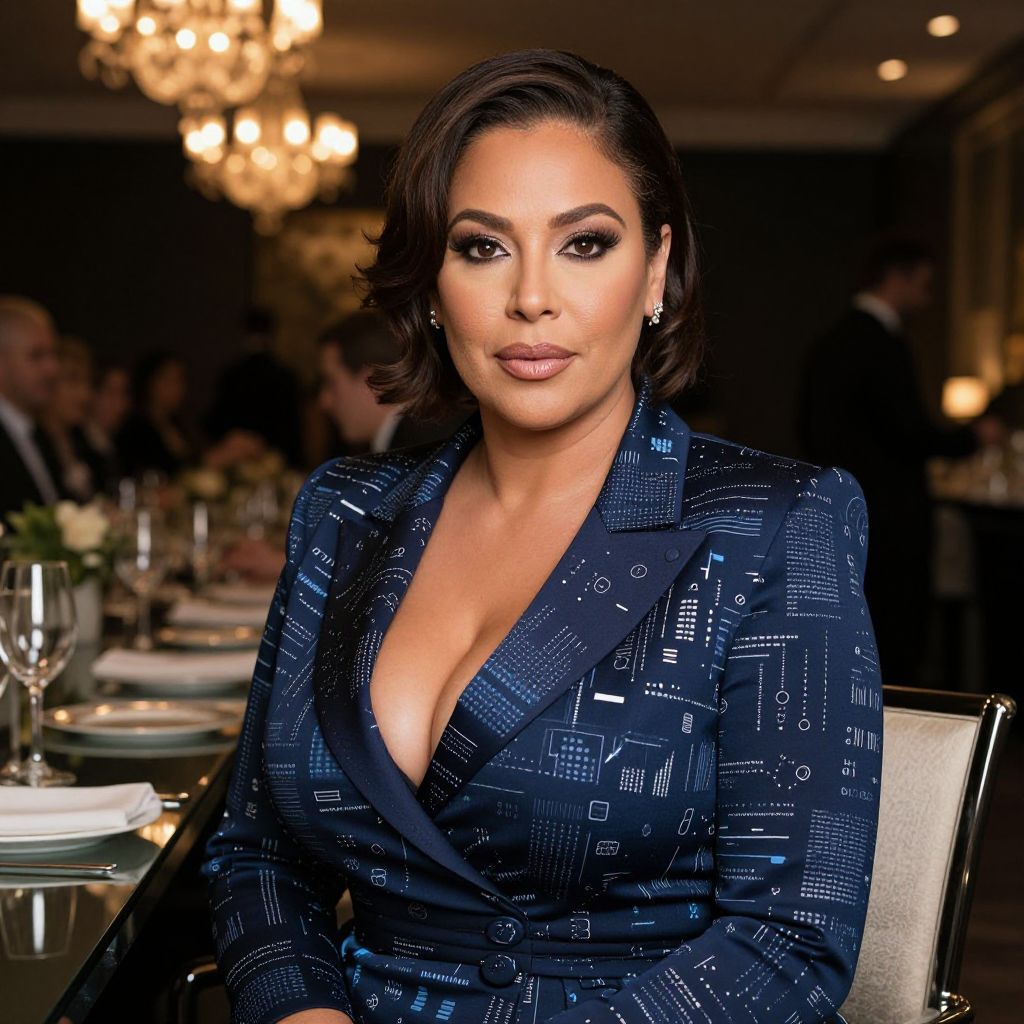 Photograph of a confident woman with medium brown skin and dark brown, shoulder-length hair styled in soft waves. She is wearing a deep navy blue, patterned blazer with a plunging neckline, revealing a hint of cleavage. Her makeup is elegant with dark, defined eyebrows, smoky eyes, and nude lipstick. She sits at a dimly-lit restaurant table adorned with white plates, wine glasses, and a small floral arrangement. The background features blurred patrons and a glowing chandelier, creating a sophisticated ambiance. Her expression is poised and slightly smiling.