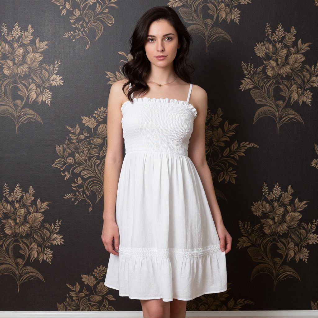Photograph of a young woman with long black hair, wearing a white, sleeveless, smocked dress, standing against a black floral-patterned wallpaper