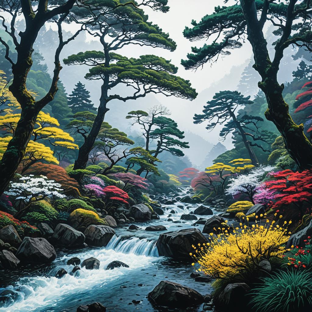 Digital artwork depicting a misty Japanese forest with a clear flowing stream surrounded by vibrant, intricately detailed trees and flowering bushes in traditional Japanese colors. The early morning light casts dynamic shadows, enhancing the lush environment with various hues of green, yellow, red, white, and purple foliage. The scene combines elements of shine hanga style with aizome patterns, creating a lively and energetic natural landscape.