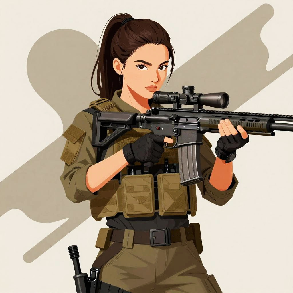 A confident young woman dressed in tactical gear holds a modern sniper rifle, depicted in a detailed digital illustration style with strong lines and muted earthy tones. The background features abstract shapes that enhance the dynamic and edgy composition, highlighting her poised and determined expression.