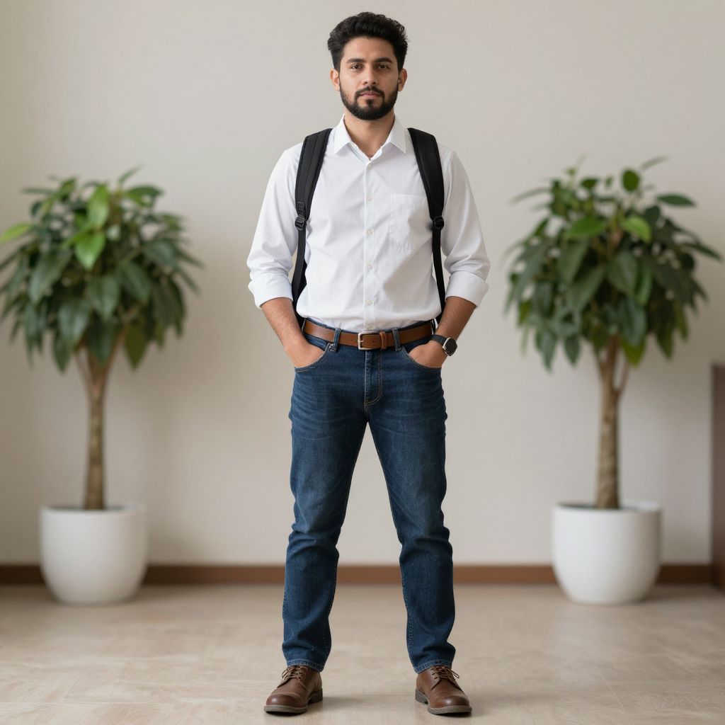 Office wear pants costume, 1boy, male focus, facial hair, shirt, pants, denim, hands in pockets, jeans, beard, belt, black hair, standing, plant, blurry, indoors, full body, brown footwear, potted plant, solo, shoes, short hair, brown belt, backpack, collared shirt