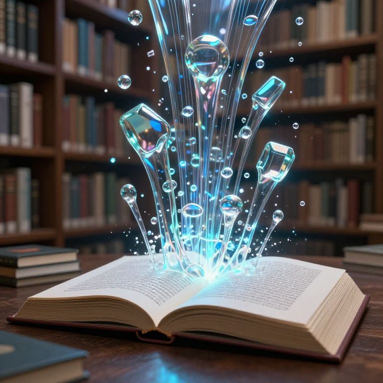 In a surreal, cyberpunk-inspired library, an open book bursts forth with cascading streams of liquid glass, transforming into a dynamic, computer-generated spectacle as it solidifies into a glowing narrative, symbolizing the unique stories that emerge when read by different individuals.