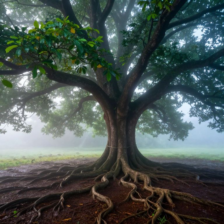 Visualize an ethereal landscape where a venerable tree commands the heart of a misty glade, its gnarled roots crafting intricate patterns on the ground as if recounting timeless stories. From a unique vantage point akin to that of an insect's eye, observe how delicate tendrils of fog embrace the colossal trunk and intertwine with the vibrant foliage, evoking a dual spectrum of tranquility and mystery. Soft, diffused light pierces through the overhead canopy, casting whimsical shadows over the surroundings and bathing the scene in a captivating palette of colors that dance across the moist soil and glistening dewdrops, inviting the viewer to plunge into this dreamlike domain where reality and fantasy blend seamlessly.