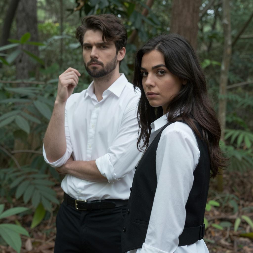 Photograph of three people standing in front of a palm tree at dusk. Central man with short brown hair, light blue shirt, and black suspenders, serious expression. Woman on left with dark hair, white tank top, intense gaze. Woman on right with brown hair, black tank top, leaning against tree, neutral expression. Dark blue sky in background.