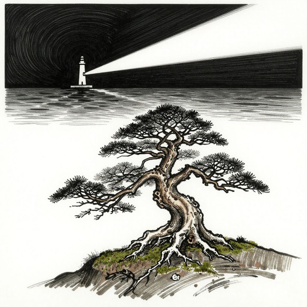 This digital drawing features a gnarled, ancient bonsai tree with twisted branches and sparse, dark green needles, rooted in rocky soil. In the background, a stark black and white contrast shows a distant lighthouse emitting a bright beam of light across a calm, reflective body of water. The lighthouse is positioned in the upper left quadrant, while the bonsai tree occupies the lower half of the image. The style combines elements of traditional Japanese art with a modern, high-contrast, black-and-white graphic approach, emphasizing the dramatic interplay between light and shadow.