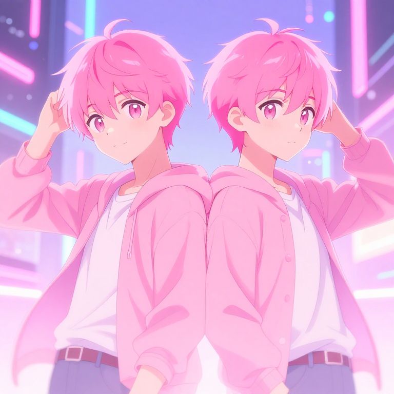 Pink anime boys with vibrant pastel hair standing in a futuristic cityscape, glowing neon lights, soft shading, detailed anime style, dynamic poses, vibrant pink and purple hues, expressive eyes, high contrast, whimsical atmosphere.