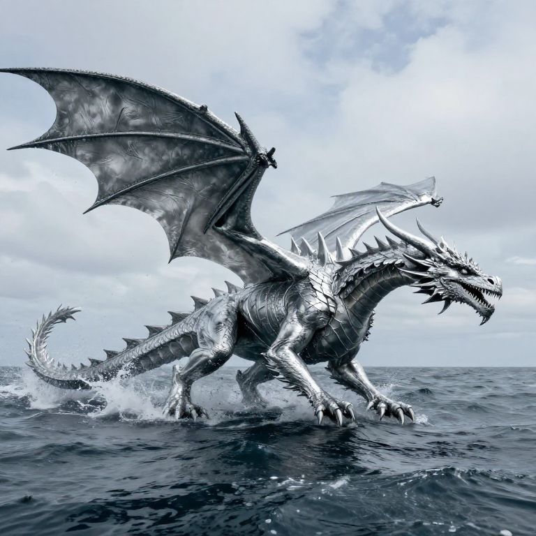 Photorealistic digital artwork of a silver, winged dragon with sharp spikes, splashing in dark ocean waves under a cloudy sky.