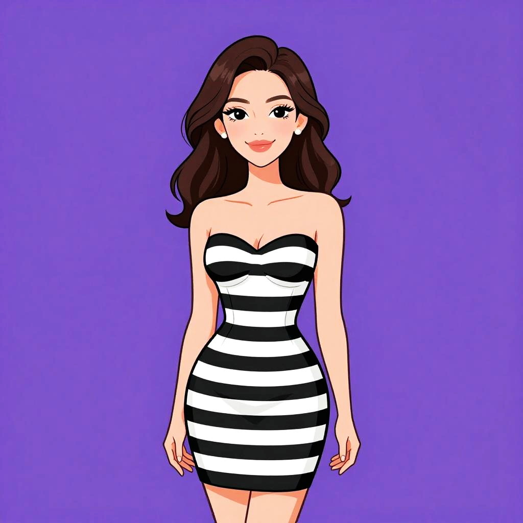 Woman with pretty face and pretty hair. smiling Woman, chic, strapless bodycon mini dress with black and white horizontal stripes, sweetheart neckline, form-fitting silhouette, above knee-length. --sref 1461