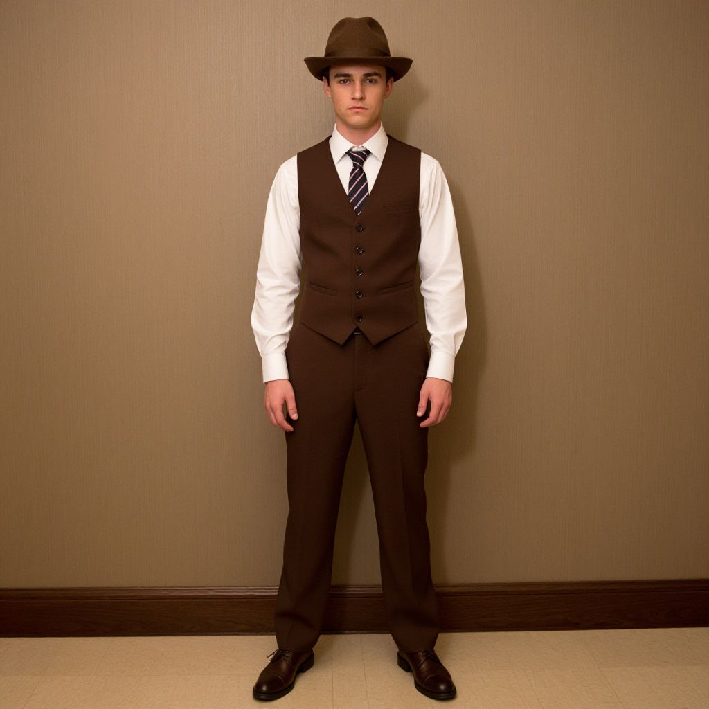 "great gatsby costume, 1boy, male focus, solo, necktie, hat, vest, striped necktie, realistic, indoors, standing, brown headwear, pants, full body, shirt, brown footwear, brown pants, brown vest, looking at viewer, white shirt, shoes Realistic photo of casual sexy person with pretty face"