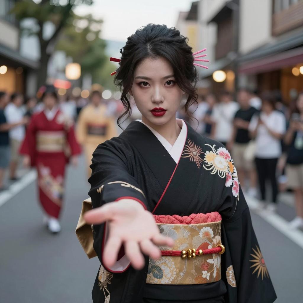Asian woman in a black kimono with red and gold patterned obi, dark wavy hair with pink hairpins, pale skin, red lipstick, extending her right hand forward. Background: blurred crowd, street, trees, evening light. Street performers and onlookers. Her intense expression, dark eye makeup. Photograph.