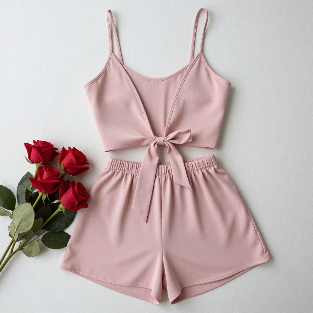 Elegant pink loungewear set featuring a bow-tied open-back top and matching shorts, complemented by a vibrant trio of red roses to the left.