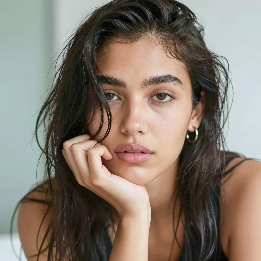 Photograph of a young woman with light brown skin, long dark brown hair, and brown eyes. She wears a white spaghetti strap top, small gold hoop earrings, and has a serious expression. Her left hand touches her hair. Tropical background with palm tree and green leaves. She is positioned slightly to the right, facing the camera.