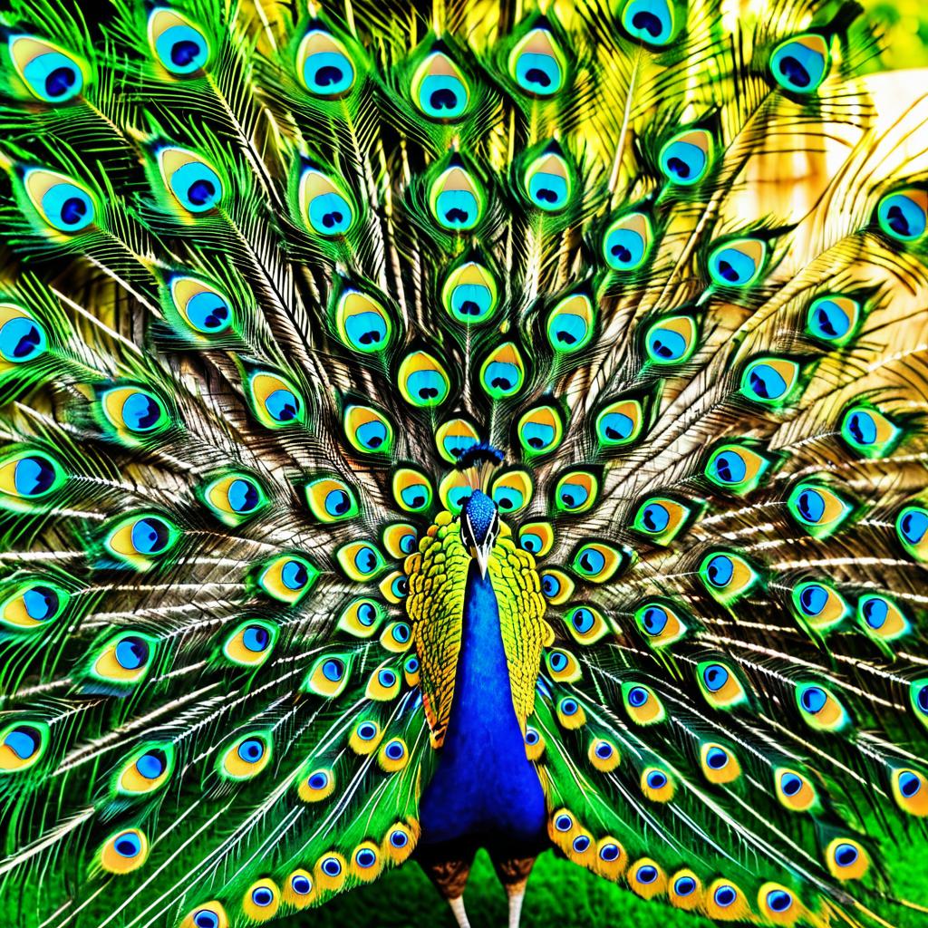 A photo of a stunning peacock displaying its feathers, illuminated by sunlight, high detail, 35mm lens, photorealistic.
