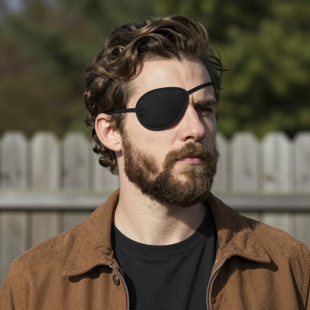 A man with curly red hair, wearing an eyepatch over his right eye. He has a determined expression and is adjusting his high-collared dark jacket with his left hand. Clear blue sky in the background.