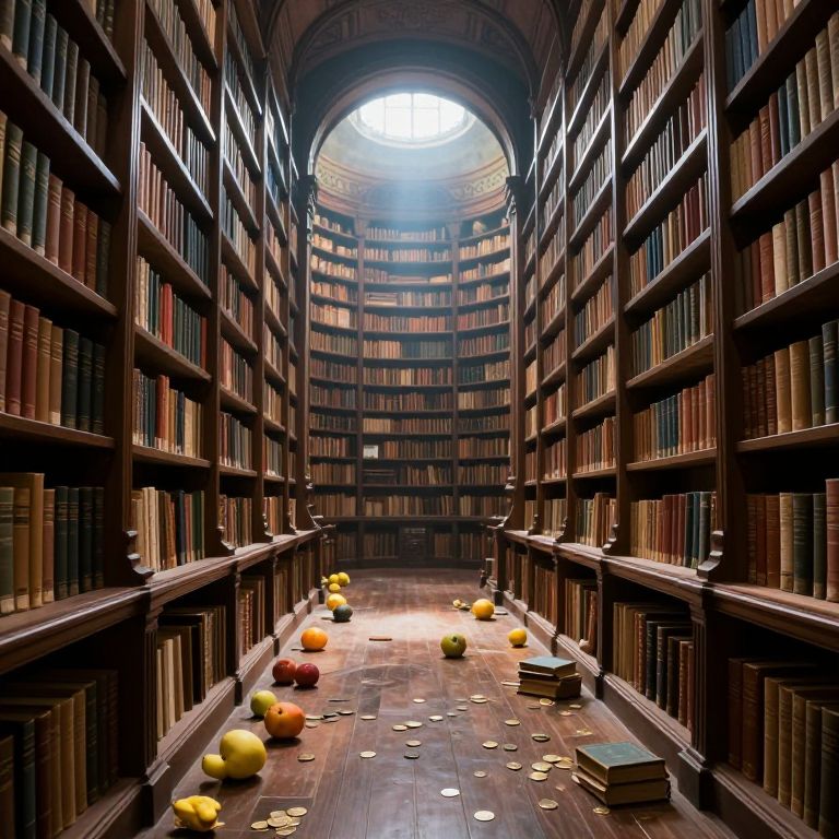 A timeless library bathed in ethereal light, its endless rows of ancient tomes stretching toward a celestial archway, while scattered fruits and coins lie abandoned on the floor, hinting at a world where knowledge and nature intertwine in unexpected harmony.