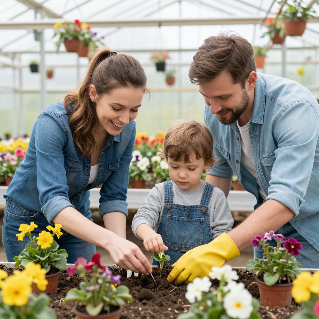 Photograph of a smiling Caucasian family planting colorful flowers in a greenhouse, father in blue shirt and yellow gloves, mother in denim shirt, and young boy