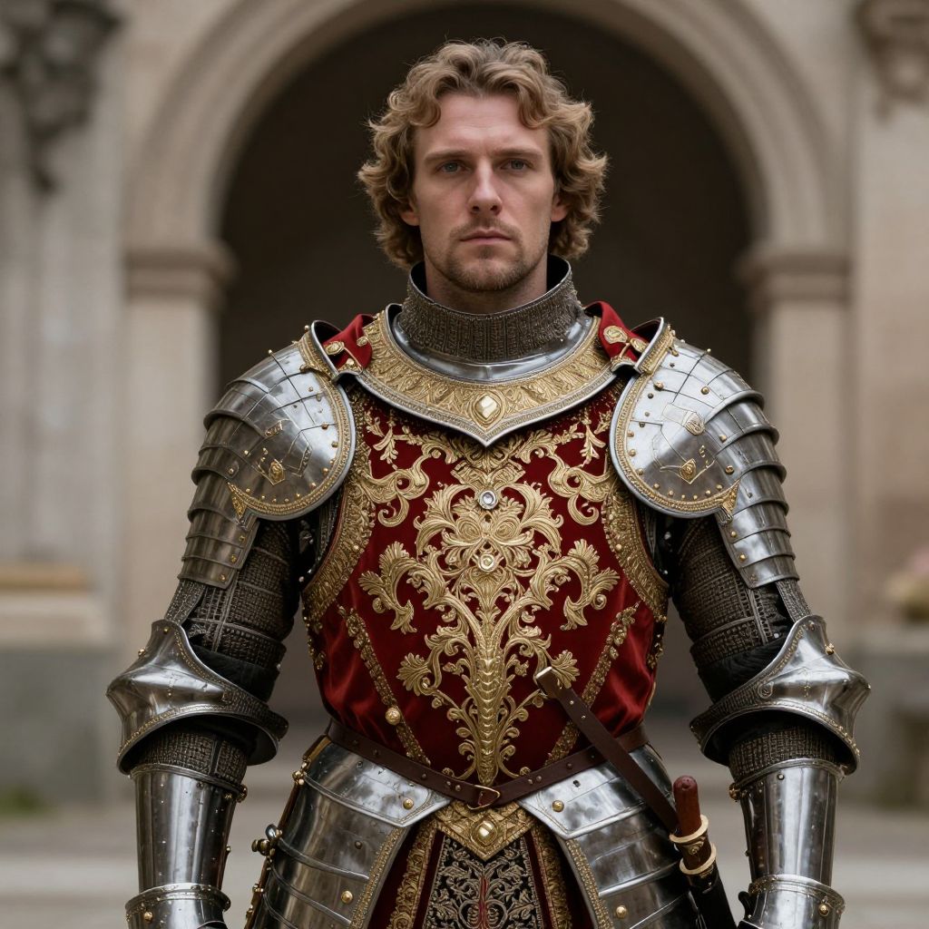 A man in ornate, baroque-style armor reminiscent of the 16th century, with intricate designs and a red and gold color scheme.