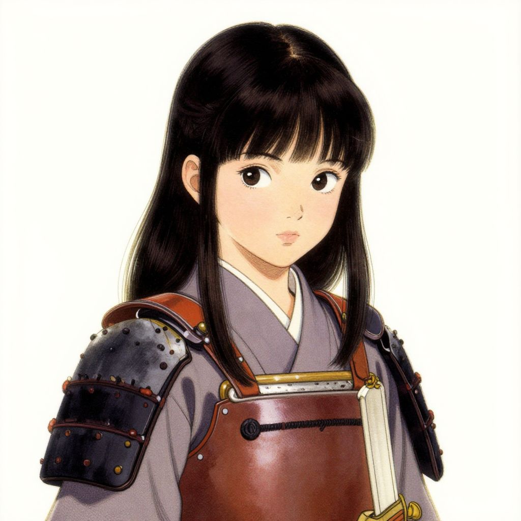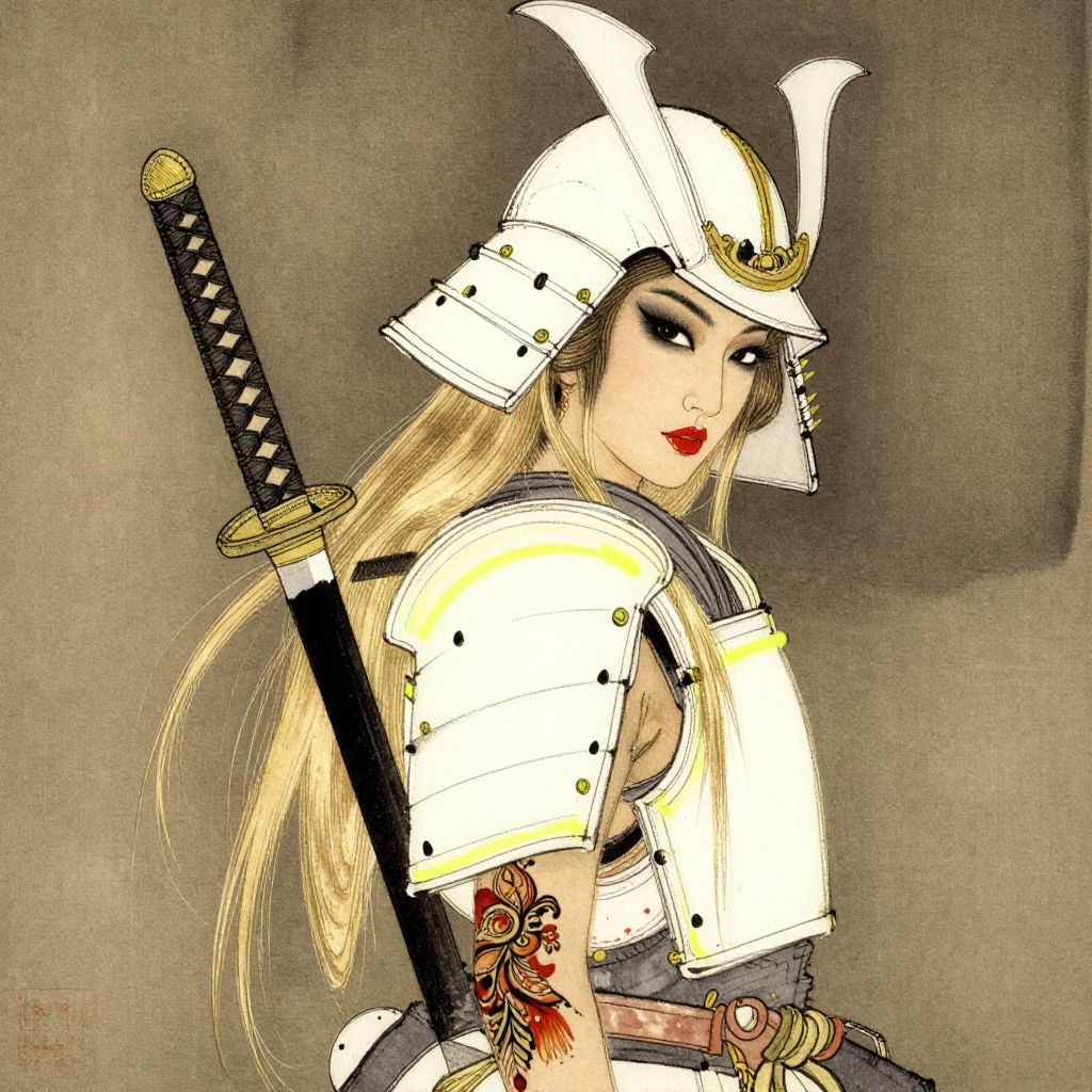 Digital drawing of a futuristic samurai in white armor with yellow accents, holding a sword, set against a beige background with red circles.