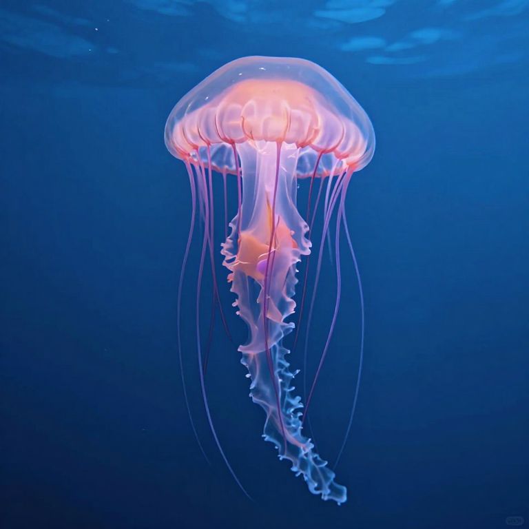 Photograph of a glowing, translucent jellyfish with pink and blue hues, floating in deep blue ocean water, illuminated from within.