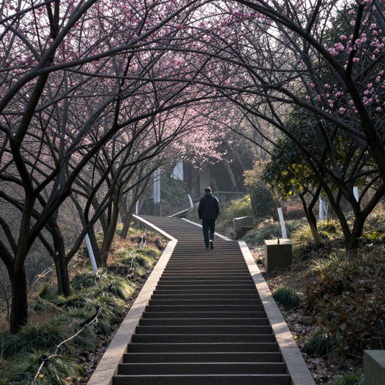 A photograph of a serene outdoor staircase lined with blooming cherry trees in pink and purple. A solitary figure, dressed in a dark blue coat and black pants, walks up the stairs, silhouetted against the bright, sunlit sky. The stairs are flanked by white railings and surrounded by lush greenery and grasses. The cherry blossoms create a natural canopy overhead, casting a delicate pink hue across the scene. The background is slightly blurred, highlighting the figure and the staircase in the foreground. The image exudes a tranquil, springtime atmosphere.