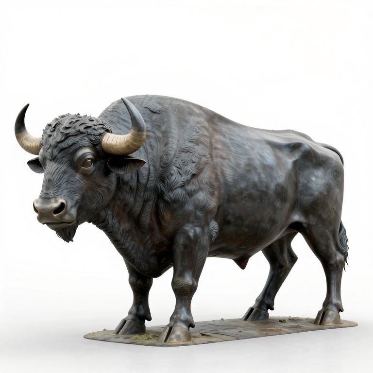 Photograph of a highly detailed, life-sized, black wax or resin statue of a bison. The bison has a thick, textured coat with a glossy finish, prominent beige horns, and a slightly raised head, gazing forward. Its large, expressive eyes and detailed fur texture are evident. The bison stands on a rectangular, metallic base, with its front legs slightly apart. The background is completely white, emphasizing the statue's intricate details and dark color. The bison's robust build and muscular structure are highlighted, showcasing a realistic and lifelike representation.