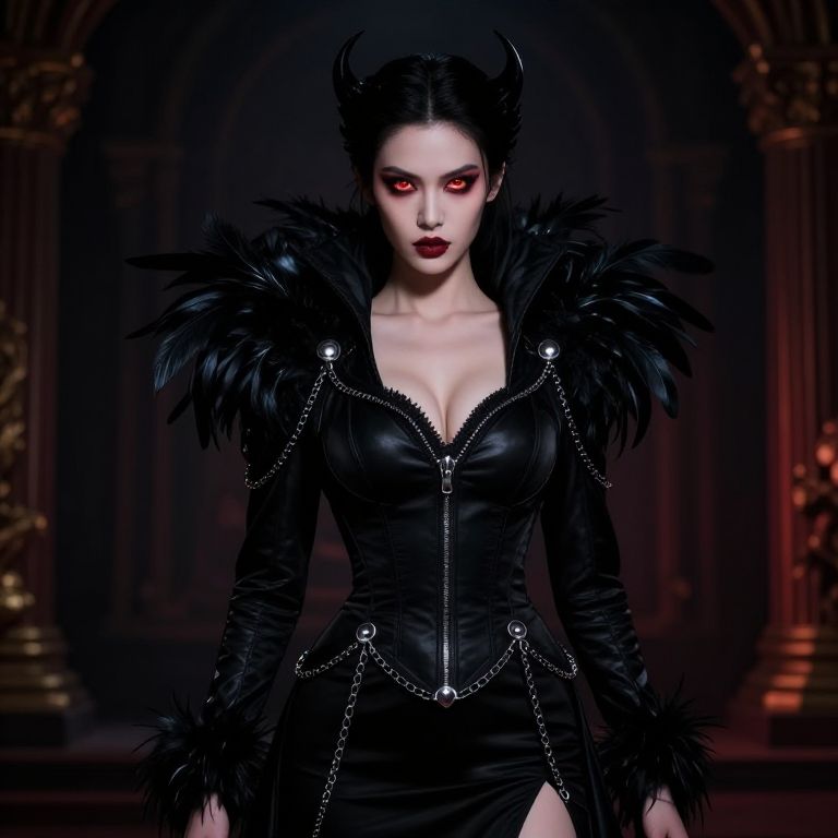 Evil queen jacket featuring black feathers and metallic chains, tight fit with sharp edges, enchanted dark palace interior, ominous and powerful aura with fiery eyes