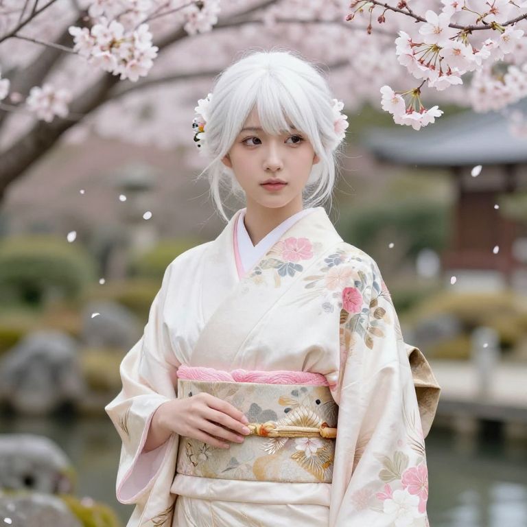 Asian girl white hair wearing traditional silk kimono with intricate floral patterns, cherry blossoms gently falling around her, calm and graceful pose, delicate makeup, vibrant background of a serene Japanese garden in springtime, high detail illustration