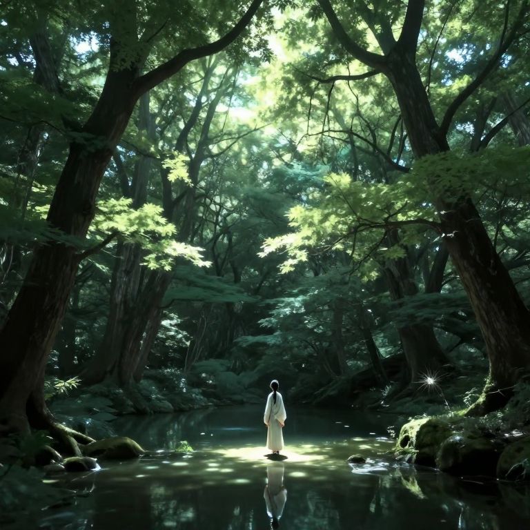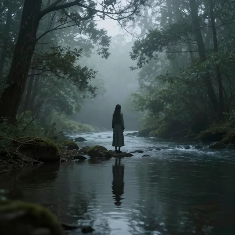 A serene forest scene rendered in a high-definition digital art style captures a solitary figure standing on a rock by a tranquil river, surrounded by misty greenery and cascading water, evoking a timeless, ethereal atmosphere reminiscent of a dreamlike narrative where the river flows backward through memory.
