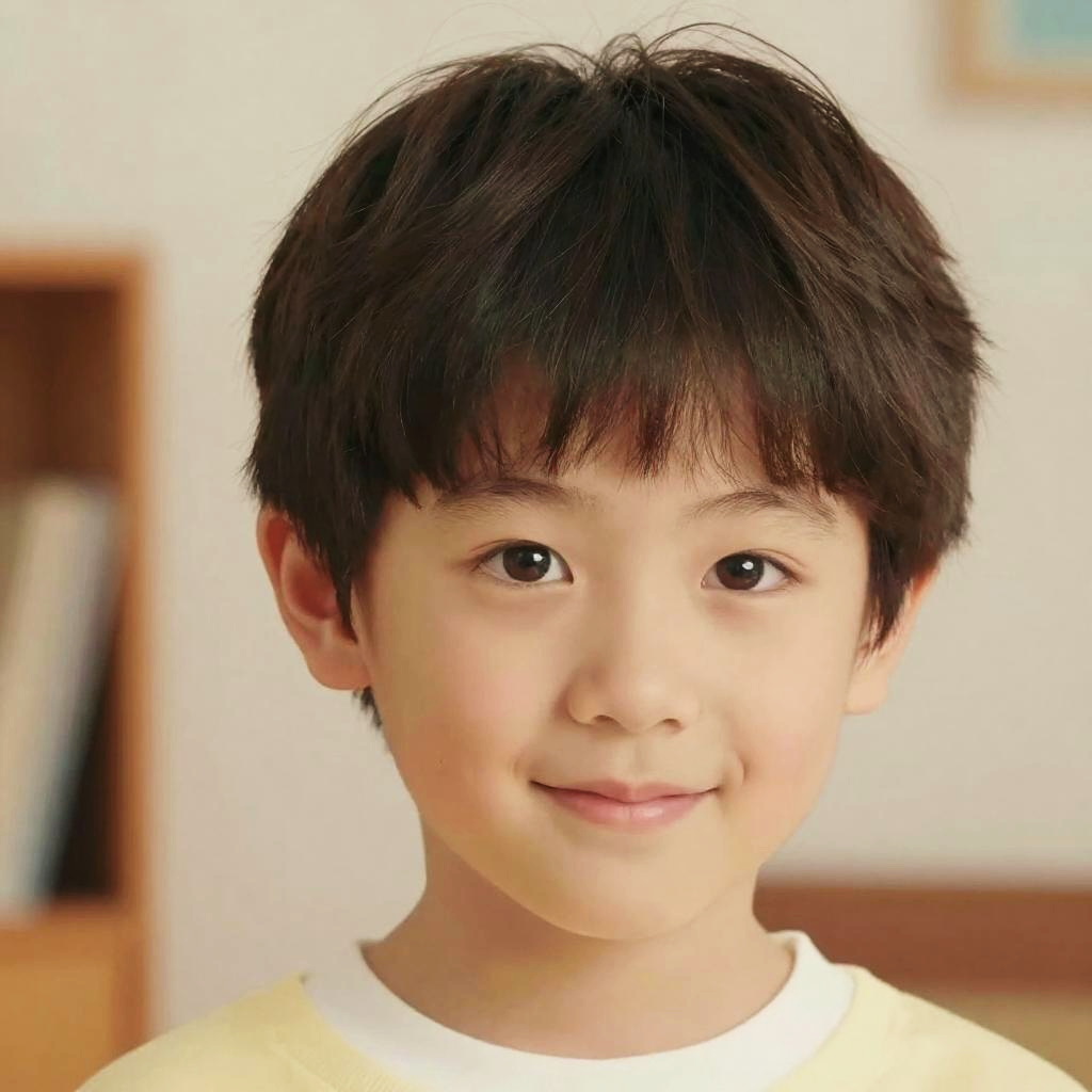 Close-up portrait of boy with bowl cut, vintage 90s fashion, warm pastel colors, detailed hair strands, playful smile, soft focus background, realistic illustration
