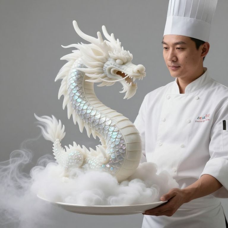 A chef in pristine whites tenderly presents a majestic dragon crafted from ethereal clouds, its shimmering scales and fierce visage defying the boundaries of reality as it stands poised on a platter of soft, billowing mist.