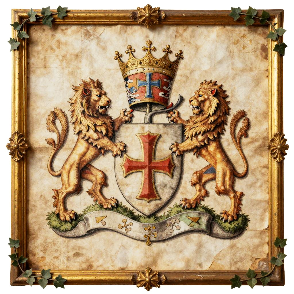 Medieval royal coat of arms depicted on a worn parchment, with faded ink, intricate medieval iconography, lions rampant and heraldic crosses, surrounded by a golden frame with ivy accents