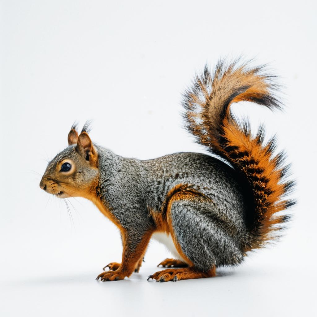 A full-body, side-view shot of a squirrel with detailed fur texture and vibrant colors. The squirrel is posed against a clean white background, showcasing its bushy tail with black and orange accents, and bright eyes. The lighting is cinematic with a natural Kodak-film tone effect, enhancing the hyper-realistic details of the squirrel's gray and orange fur.