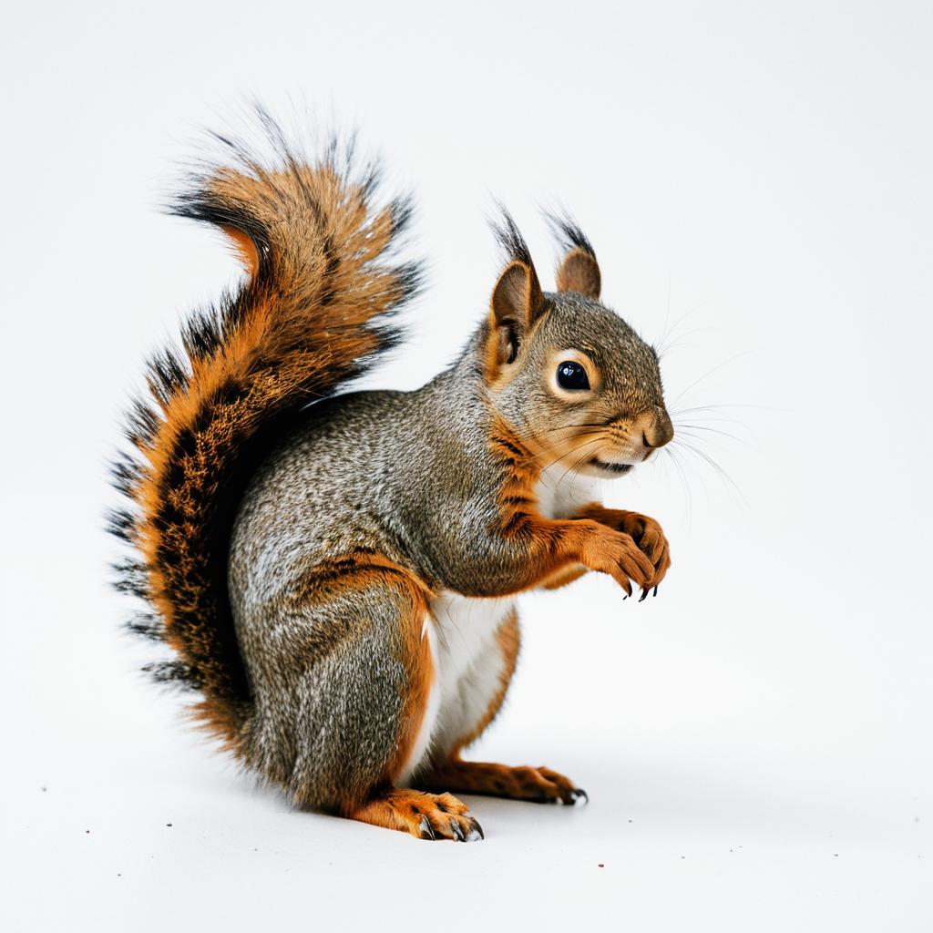 A full-body, side-view shot of a squirrel, on a white background, cinematic lighting, natural kodak-film tone, hyper-realistic details, vibrant and beautifully color-coded