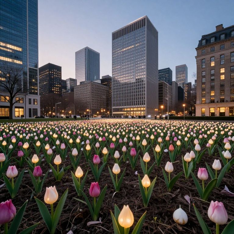 Photograph of a cityscape at dusk with a vast field of illuminated tulips in the foreground. The tulips, displaying pink and white hues, are glowing with small, warm white lights. Tall, modern skyscrapers with reflective glass windows and illuminated office lights form the background, contrasting with a historic building on the right. The sky is a gradient of blue, transitioning from darker at the top to lighter near the horizon. The ground is dark and soil-covered, with tulip leaves and stems visible. The scene combines urban and natural elements, creating a serene, vibrant atmosphere.