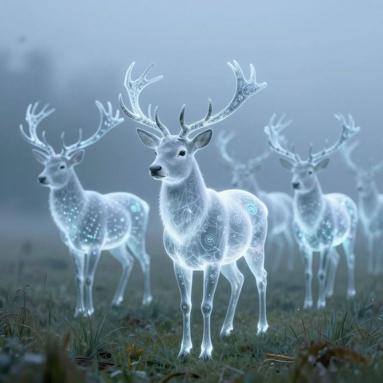 Photograph of four glowing white deer with intricate, luminescent antlers and body patterns, standing in a misty, blue-tinted forest. The deer are ethereal, with their outlines and details illuminated by a magical glow. Their antlers branch out elegantly, and their fur is delicately detailed with light spots. The background is blurred, featuring a foggy, dimly lit forest, creating a mystical atmosphere. The grass in the foreground is dark and slightly blurred, contrasting with the bright, glowing deer. The image has a surreal, fantasy-like quality, emphasizing the enchanting, otherworldly appearance of the illuminated deer.