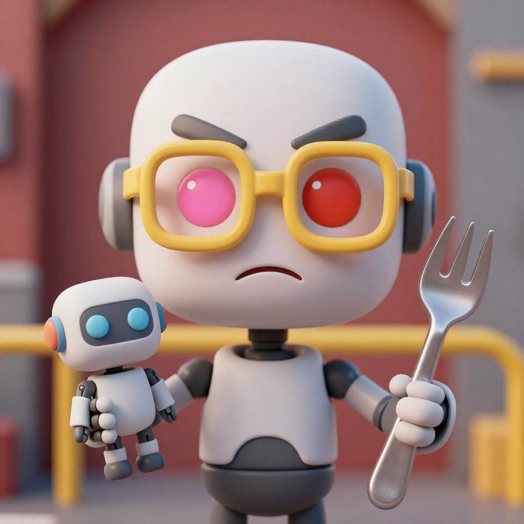 Digital 3D character with a robotic head, yellow glasses, and mismatched eyes (pink and red). Holding a small robotic figure with one hand and a fork with the other. Background includes a red wall and yellow railing. Character's expression is intense.