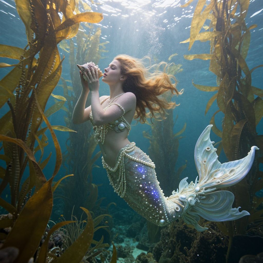 Craft an Art Nouveau-inspired image that captures a mesmerizing underwater world with a mermaid elegantly gliding through undulating tendrils of aquatic flora. The ethereal sunlight filtering through the kelp forests bathes the mystical depths in a soft glow. The mermaid's intricate, flowing attire, adorned with shells and pearls, appears to radiate like constellations against her luminescent skin as she tenderly holds a conch shell to her lips, exuding an aura of enchantment and tranquility within this captivating composition.