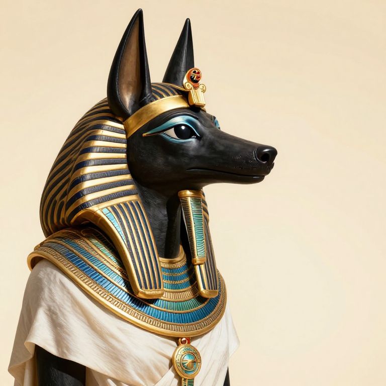 Photograph of a detailed, life-sized statue of an Egyptian Anubis figure. The statue depicts a black jackal head with large, upright ears adorned with a gold headband featuring a red gem. The jackal's eyes are strikingly blue, with bold, black eyeliner. It wears a gold and blue striped nemes headdress and a white linen cloak with an intricate gold and blue collar. A prominent gold and turquoise pendant hangs from the cloak. The background is a plain, light beige, highlighting the statue's vivid colors and intricate details. The overall style is realistic with ancient Egyptian motifs.
